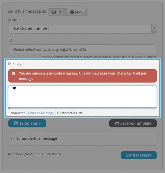 The character counter beneath the message box will update to display how many characters are left in your Unicode message, which has a limit of 70 characters.